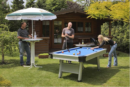 Wenn die Gartensaison vorüber ist, bereichert der Billardtisch California die langen Abende. Dieser Tisch ist das richtige Modell für Freunde des Billardsports und für solche die es werden wollen, da er sowohl draußen als auch drinnen genutzt werden kann. Durch sein formschönes und schlankes Alu-Design passt er zu jeder Wohnungseinrichtung, ob klassisch oder modern. Und das passende Zubehör beispielsweise die stilgerechte Beleuchtung finden Sie natürlich auch bei uns.